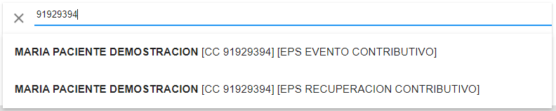 El sistema de búsqueda mostrará los pacientes encontrados junto con su convenio asociado. Tenga en cuenta que un paciente puede repetirse varias veces si tiene varios convenios activos. Por ejemplo: