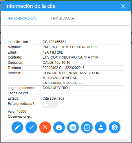 Si por el contrario lo que requiere es Cancelar la cita (porque por ejemplo el paciente no vino o desertó del servicio) debe entonces ejecutar el proceso de "Cancelación de cita" que se explica en el tutorial: Traslados y cancelaciones de citas.