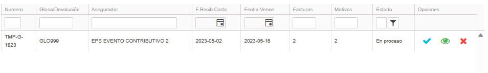 - Glosa/Devolución: Muestra el numero de la carta/glosa en el momento de su creación, también se pueden utilizar numeraciones propias en los casos de recibir glosas por otros medios como correos y otro tipo de comunicación.