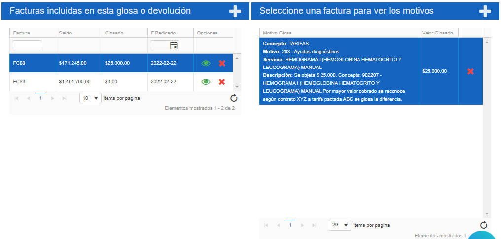 En el sistema una glosa o devolución puede contener una o muchas facturas asociadas.
